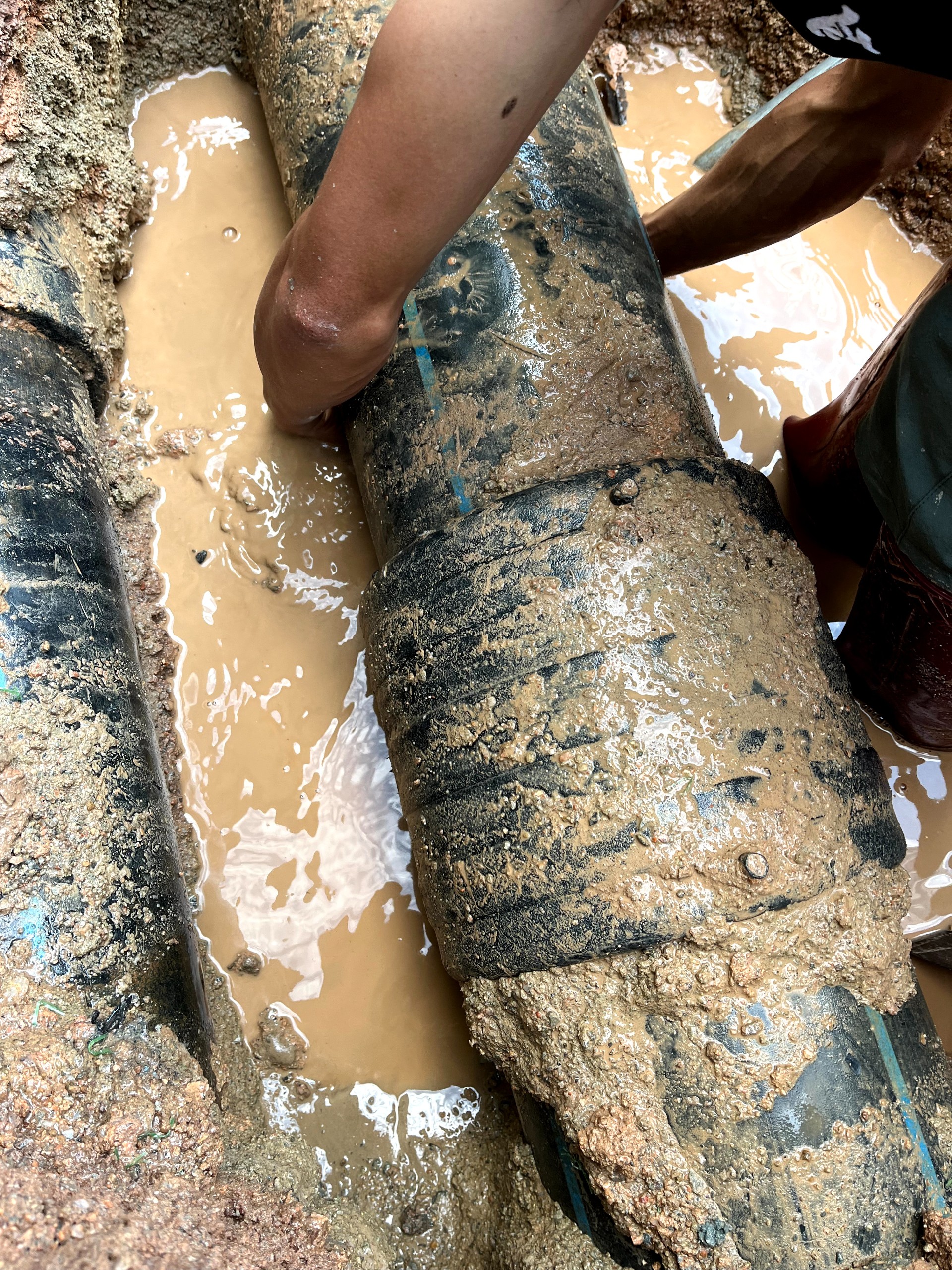 室外我们找到疑似漏水处,先进行打孔验证,可以多在周围多打几个孔来进行判断,是否有明水,地下是否是湿的。有水往上冒或者是清水,下方就是漏水点。